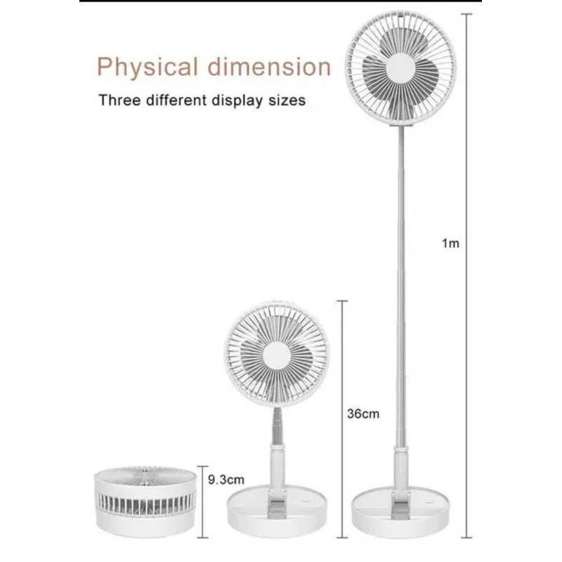 Телескопічна опора дозволяє підняти робочу частину вентилятора на висоту до 1 метра, а шарнірна конструкція забезпечує різні кути та положення вентилятора. У складеному стані вентилятор не займає багато місця, його можна брати з собою у подорож і легко зберігати, коли він не використовується, потім відновити для використання у будь-який час у будь-якій конфігурації. Вентилятор можна заряджати через USB-зарядний пристрій від павербанка, USB-порт для ноутбука, адаптер для мобільного телефону, автомобільний USB-порт і т.д. Рекомендований струм заряду 2А, мінімальний час повного заряду щонайменше 5 годин, потужність 5 Вт.